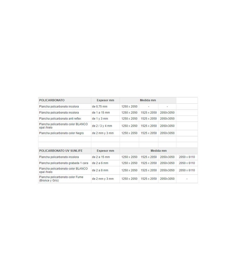 El policarbonato es un Termoplástico industrial similar al cristal, incoloro, con estructura amorfa notable por su dureza. Ofrece una alta resistencia al impacto que supera las propiedades físicas de toda su clase. Las planchas de policarbonato son ópticamente muy claras pero no tan brillantes como las de PMMA. Su resistencia a la temperatura y su estabilidad dimensional son buenas. Para uso en exteriores se recomienta Policarbonato tipo UV, con proteccion contra la radiación UV por ambas caras. El policarbonato se utiliza para la fabricación de cubiertas protectoras de maquinaria, lámparas, rótulos, carteles publicitarios, paredes de compartimentación y acristalamientos de puertas. Para aplicaciones de comunicacion visual, arquitectura e interiorismo. El policarbonato tambien se utiliza para la fabricación de pasarelas cubiertas para peatones, marquesinas de autobús, bóvedas cilíndricas y claraboyas, etc.